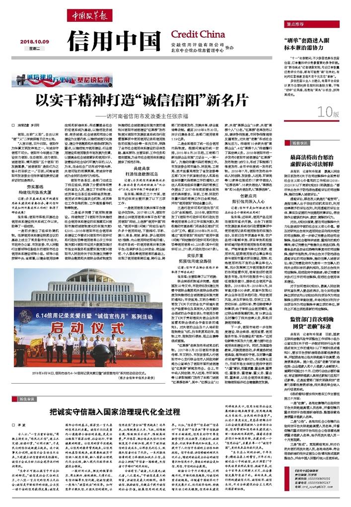 人言曰信,日升曰阳。信阳作为华夏文明发祥地之一,与诚实守信密不可分。信阳市今年提出了建设实力信阳、生态信阳、活力信阳、诚信信阳、清风信阳‘五个信阳’的发展愿景,‘诚信信阳’是我们为之奋斗的目标之一。日前,河南省信阳市发改委主任张宗福在接受记者采访时如是表示。